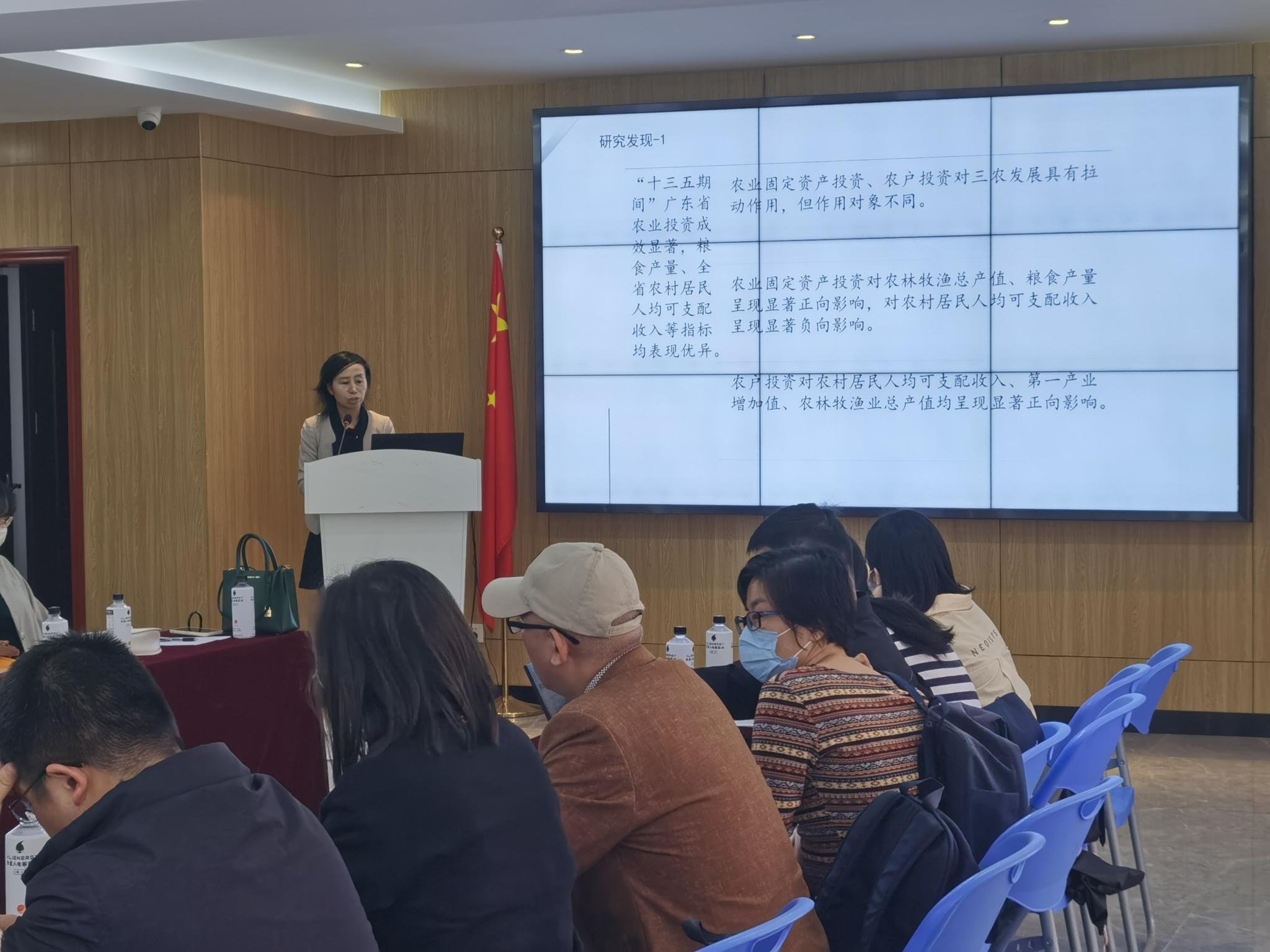 何琳以“广东省农业投资”的角度进行分析汇报,指出农业固定资产投资和农户投资是两个维度,对“三农”发展具有拉动作用,但由于作用对象不同,其影响也会产生差异。在农村金融贷款方面,何琳研究发现内生增长绝对不足会导致需求型金融抑制,使金融贷款存在一定瓶颈期。最后,何琳提出相应的对策建议,如探索财政投入的优化机制,拓展公共物品的正外部性;完善农村产业金融配套服务机制,突破需求型金融抑制等。