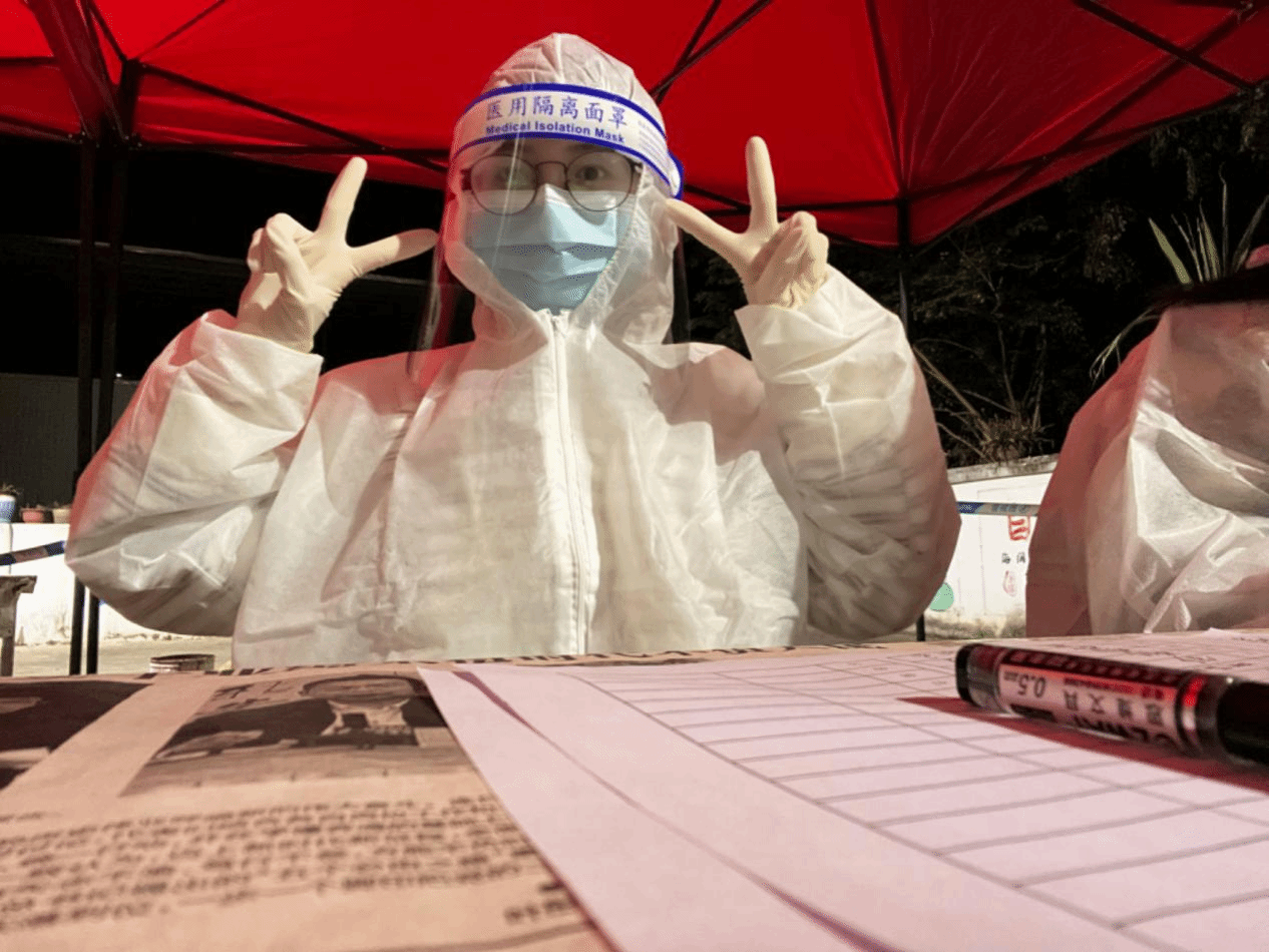 刚刚参加工作的她就遇上当地的新冠肺炎疫情爆发,必须马不停蹄投入到抗疫工作中,除了下乡组织村民到村委做核酸检测,还先后抽调到隔离点负责隔离点的人员核查登记,支援隔壁的乡镇开展为期一周的入户排查,十几个人在一个大教室打地铺的经历让她迅速融入和同事打成一片,也让为民服务和艰苦奋斗的种子根植于心。