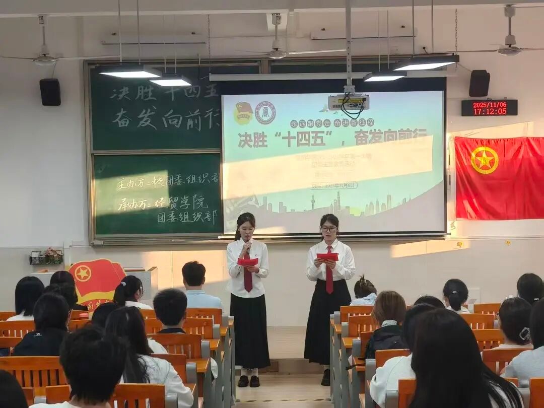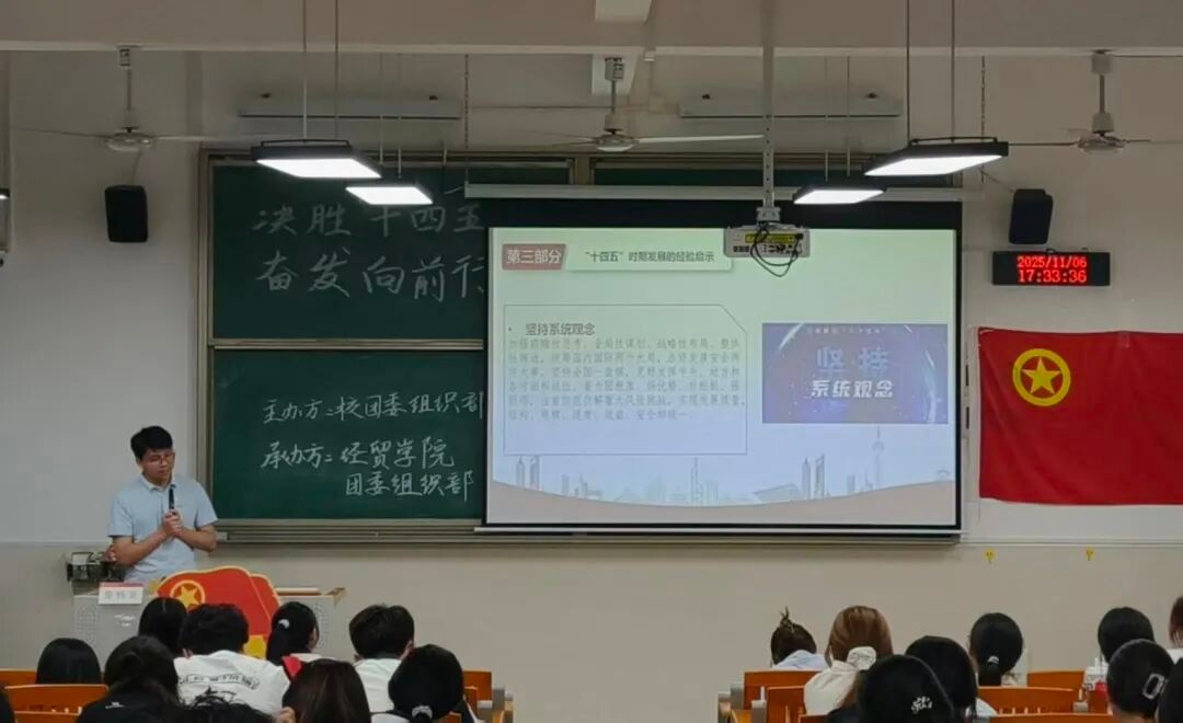 为深入贯彻落实习近平总书记关于青年工作的重要论述,准确把握习近平总书记对新时代青年发出的远征号令,进一步强化对经贸学子的政治引领。经贸学院团委特此于11月6号晚在经管楼312室组织开展以“决胜‘十四五’,奋发向前行”为主题的团课主题教育。经贸学院团委副书记徐杨龙老师、经贸学院团委学生书记团、校团委代表和青协代表参与了此次团课。