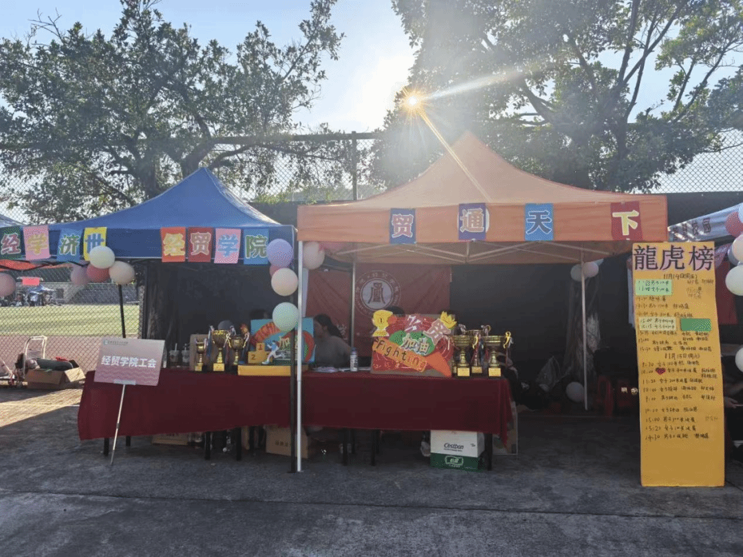 赛事热烈推进之际,后援团学子精心布置场地、构思应援标语,以创意装饰构筑起温馨而昂扬的赛场氛围。大本营内,蓝橙相间的帐篷下,“经学济世,贸通天下”的标语格外醒目,五彩气球轻盈点缀其间,满桌金灿灿的奖杯承载着对赛事的殷切期许——这里既是经贸参赛学子的能量补给站,更是他们凝心聚力的精神堡垒。