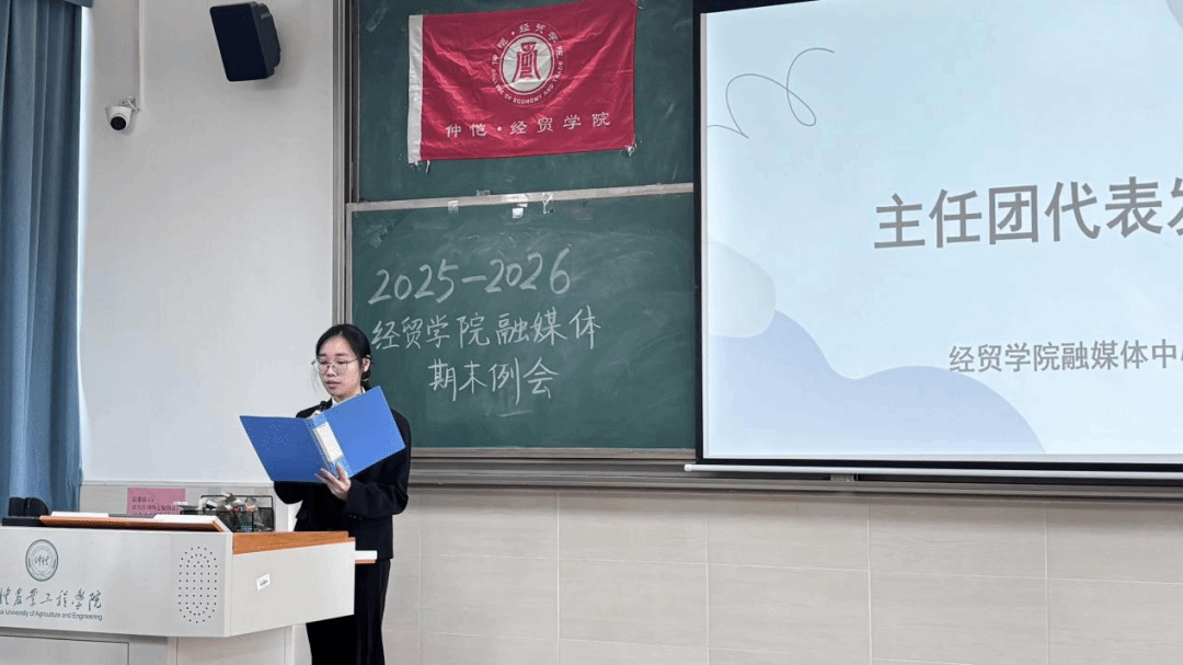 经贸学院融媒体中心主任团代表潘芷昕从整体运营角度复盘了学期工作规划的落地情况与成效,并总结上学期各部门工作成果:运营部运营公众号、摄编部展现校园风采、易班部对接校易班并承办特色活动,强调部门间衔接顺畅、配合默契,展望融媒体中心在老师指导下越来越好。