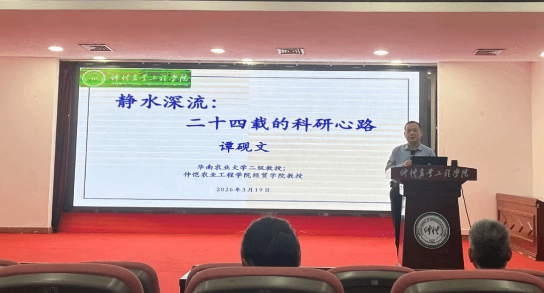 3月19日下午,华南农业大学经济管理学院二级教授谭砚文应邀莅临仲恺农业工程学院海珠校区学术报告厅,为经贸学院全体教师作题为“静水深流:二十四载的科研心路”的学术讲座。经贸学院党委书记邓勿致欢迎辞,副院长张眉(主持工作)作总结发言。