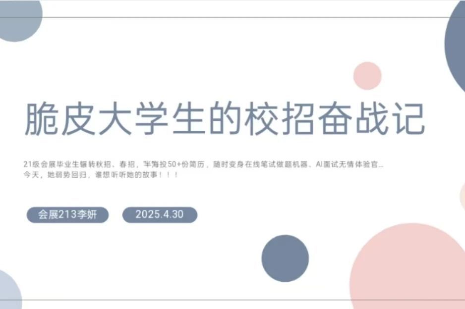 第一个分享的是会展213班的李妍,她给大家分享了自己的求职全流程心得。首先是简历方面,她建议大家针对不同公司定制不同版本的简历,通过表格记录投过哪些公司,总结经验。接着她希望大家抢占信息先机,秋招前锁定企业官网、招聘号及地方人才网等渠道信息,通过校招官网投递保障信息安全。随后她围绕银行招聘流程,详细解析了笔试中的行测、经济金融知识备考策略,以及面试中无领导小组讨论和结构化面试的应对技巧,同时她建议同学们面试时穿上合身的正装,以及准备突出优点的200字自我介绍。最后她分享了一些自己面试失败的案例,希望大家要保持紧张感,同时也要学会自我调节情绪。